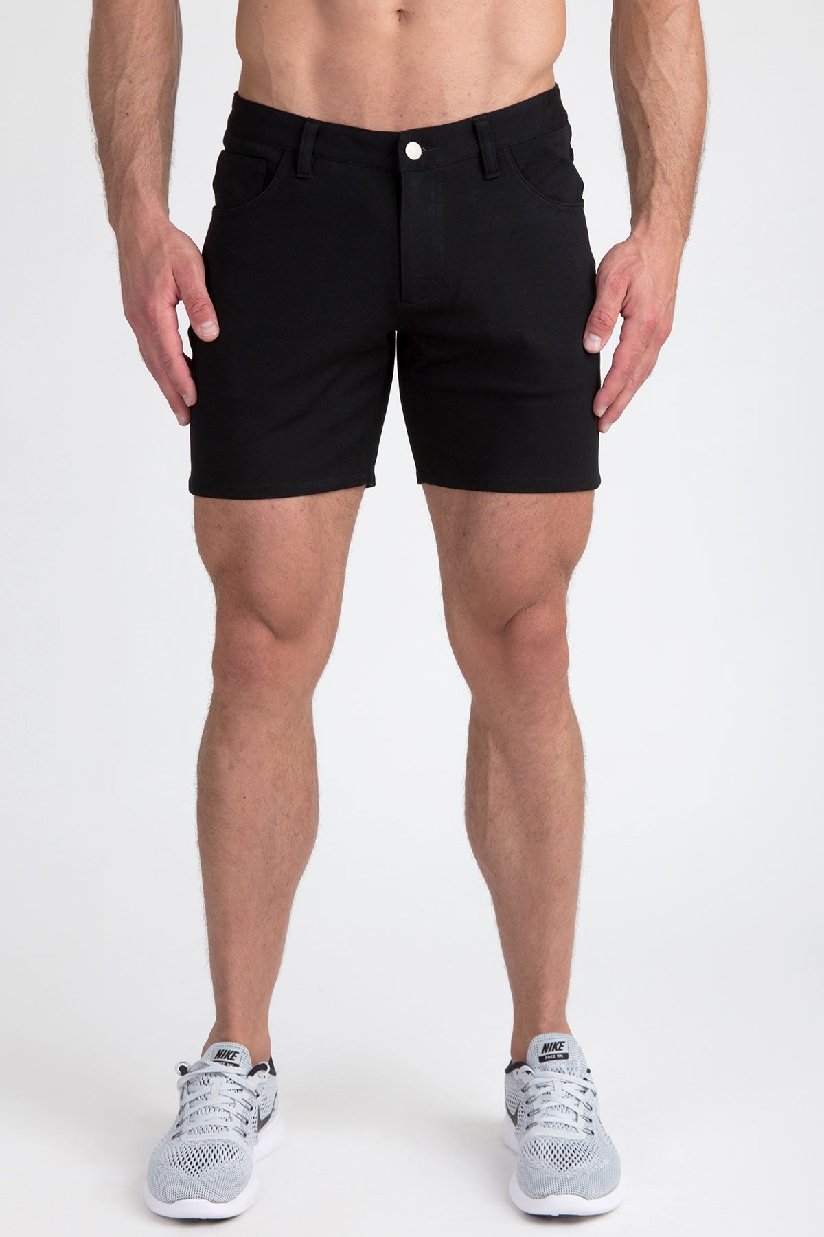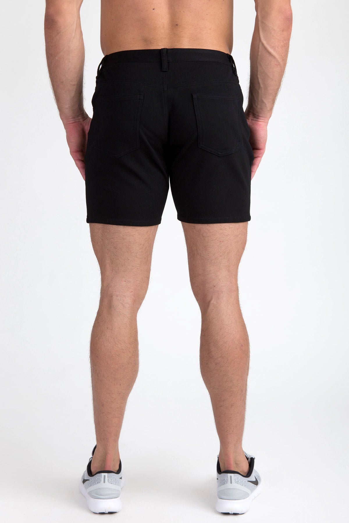 5-pocket stretch knit shorts cut slim with a shorter length for an enhanced, flattering silhouette. Features our signature curved, stretch waistband, metal rivets, zip fly and metal button closure. Fabricated from an ultra-soft, 4-way stretch knit fabric for maximum comfort and performance. The unique fabric knit structure has a super soft hand and excellent shape recovery with a lot of stretch for a perfect fit wash after wash. Inseam length is 5".