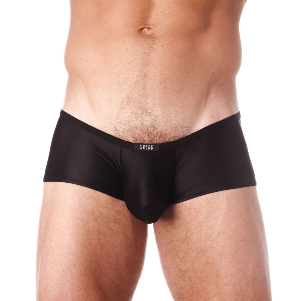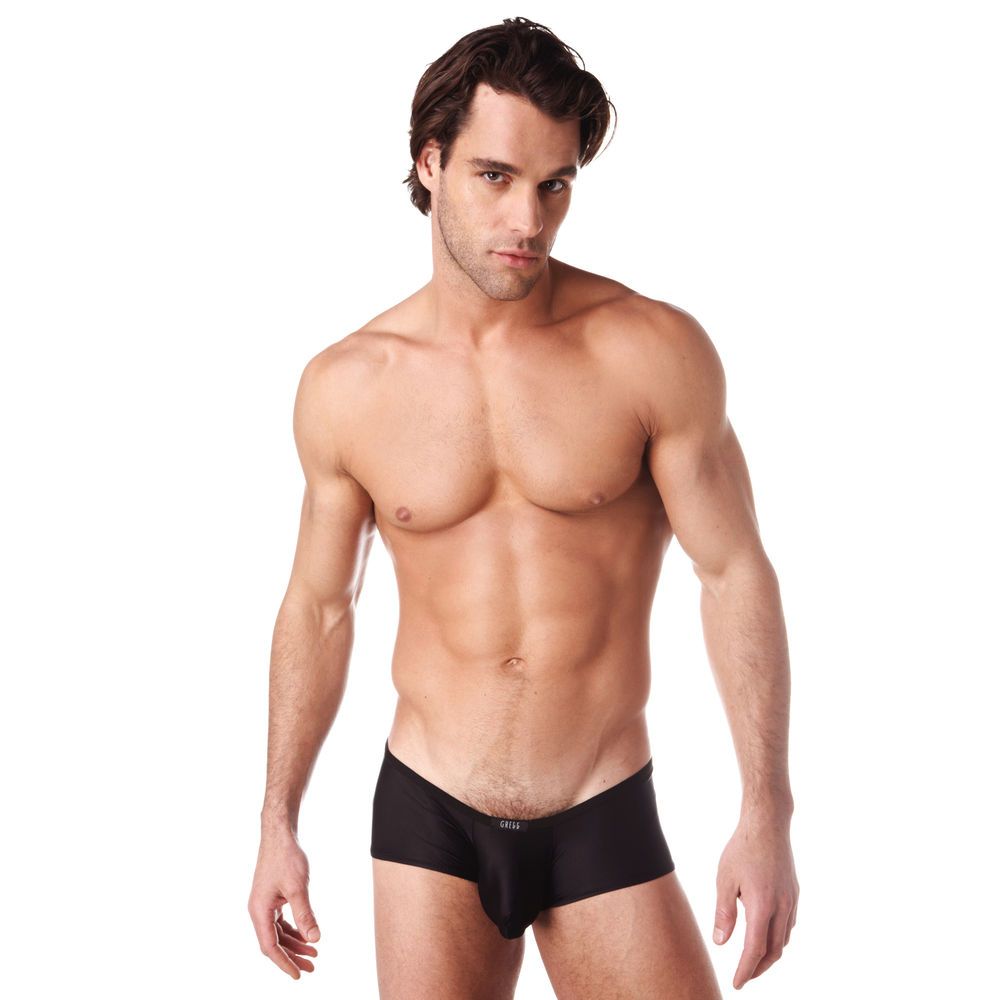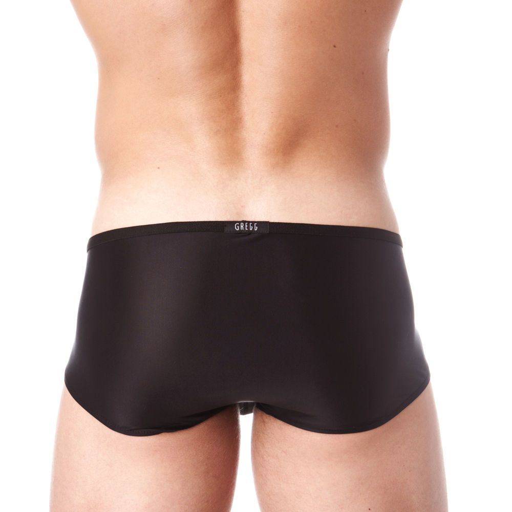 The VOYEUR collection square-cut trunks by Gregg Homme are designed in a hyperstretch microfiber with 'liquid touch' attributes. Details: square cut form-streamlining leg holes, seamless seat, high-volume center half-seamed pouch, and the Gregg Signature sewn onto front center.