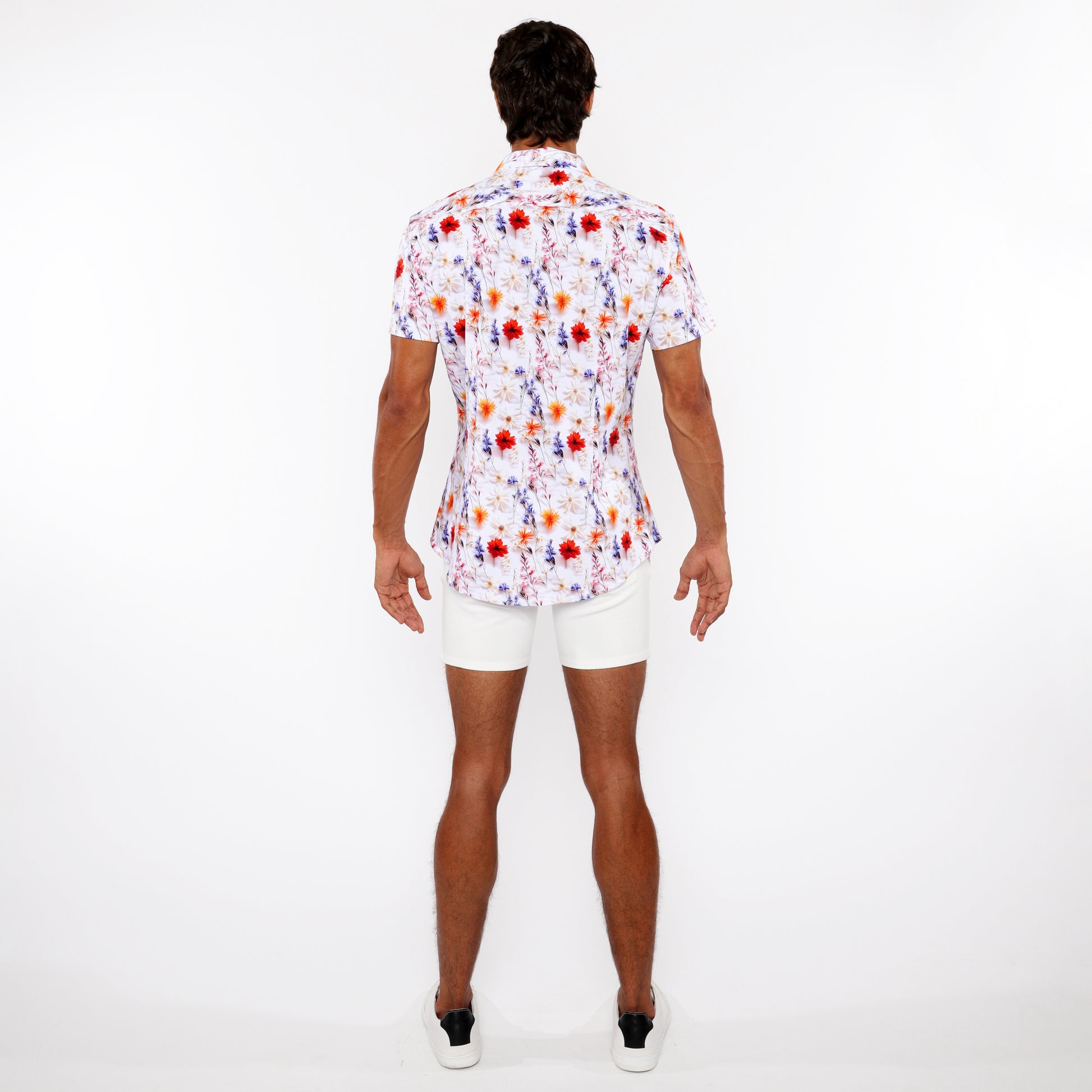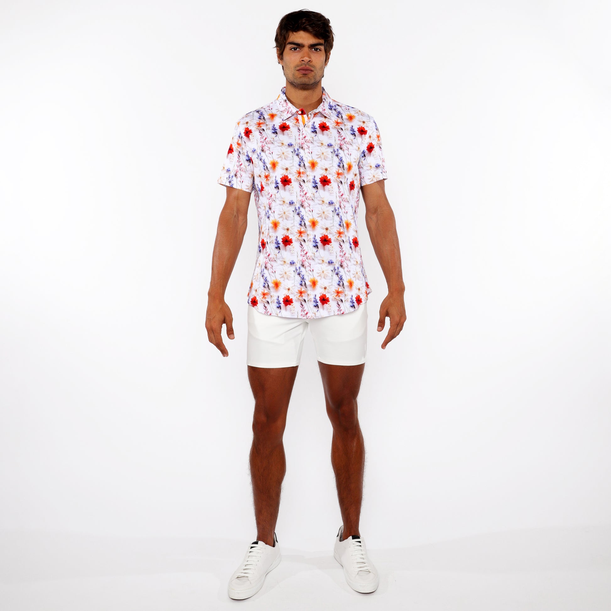 An elegant 3D blossom print finished with refined tailoring. Cut fitted through the shoulders, chest, and biceps with subtle back darts, it delivers a sculpted silhouette with a clean, modern profile. Finished with a spread collar, curved hem, and contrast stripe interior placket detail for a subtle elevated accent.