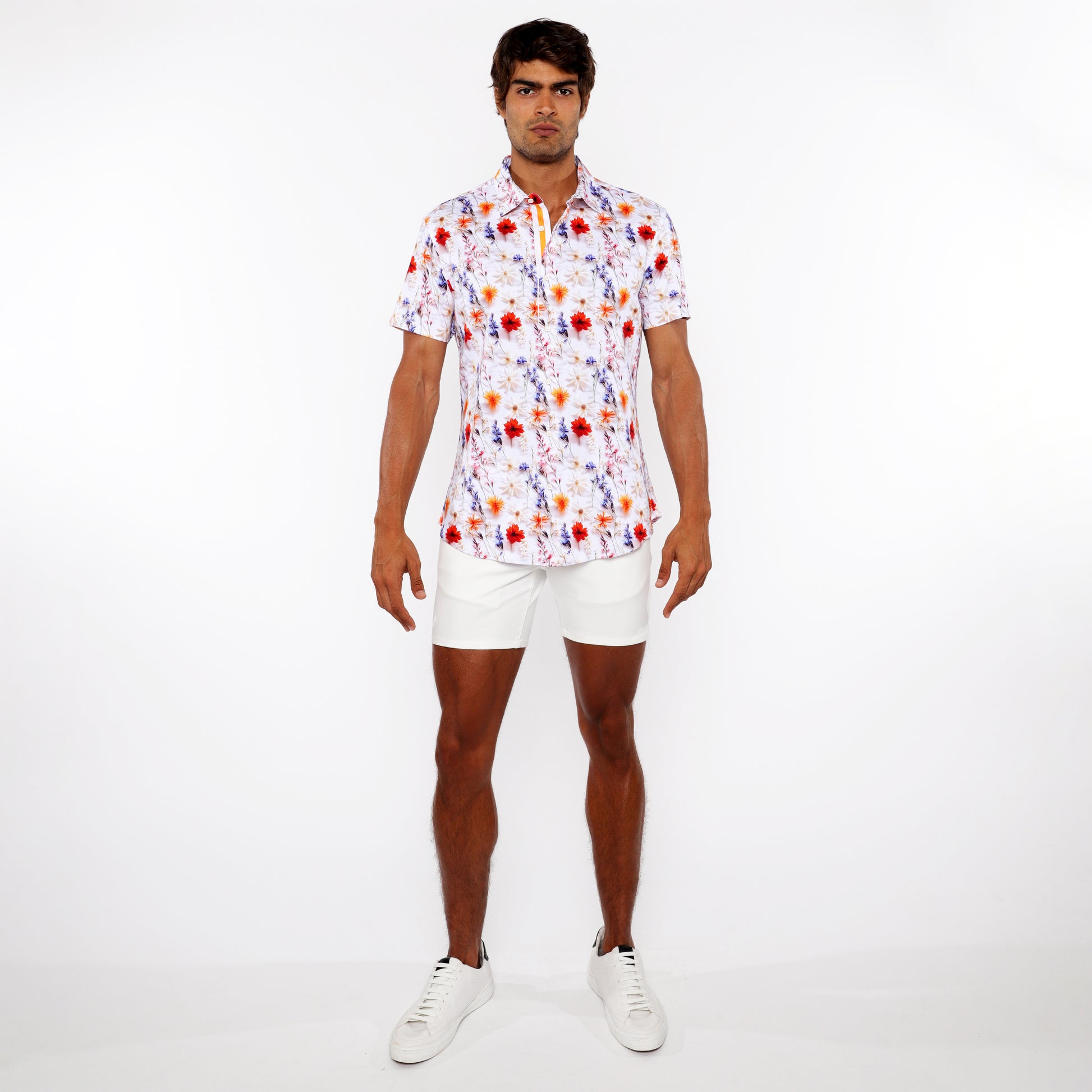 Printed on ultra-soft cotton jersey, the ecru base is accented with red, violet, and gold blossom motifs that create dimensional depth. Seamless print alignment across the placket ensures precision and a continuous visual flow.