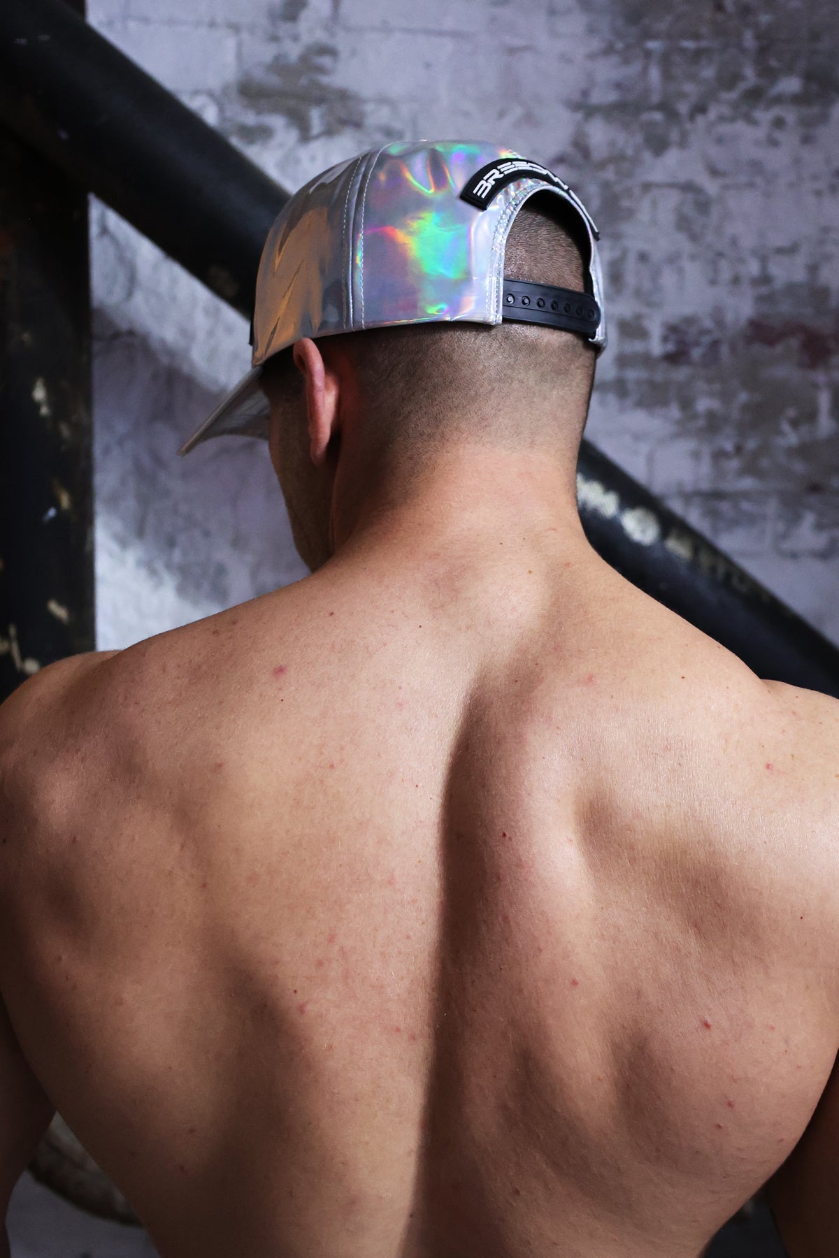 Using a futuristic light-reflecting vinyl in lime, blue, red, and silver - the new HOLO HAT looks like hot glowing liquid splashed across a stylish curved brim hat. Wear it low when you want to look like trade. Wear it high and to the side when you’re lookin’ for trade. With our HOLO HAT, size really doesn’t matter. The adjustable snap-back makes it perfect for any-sized head. With a PVC logo patch on the front and the back, everyone will know exactly who you are - a BREEDWELL man from head to toe.
