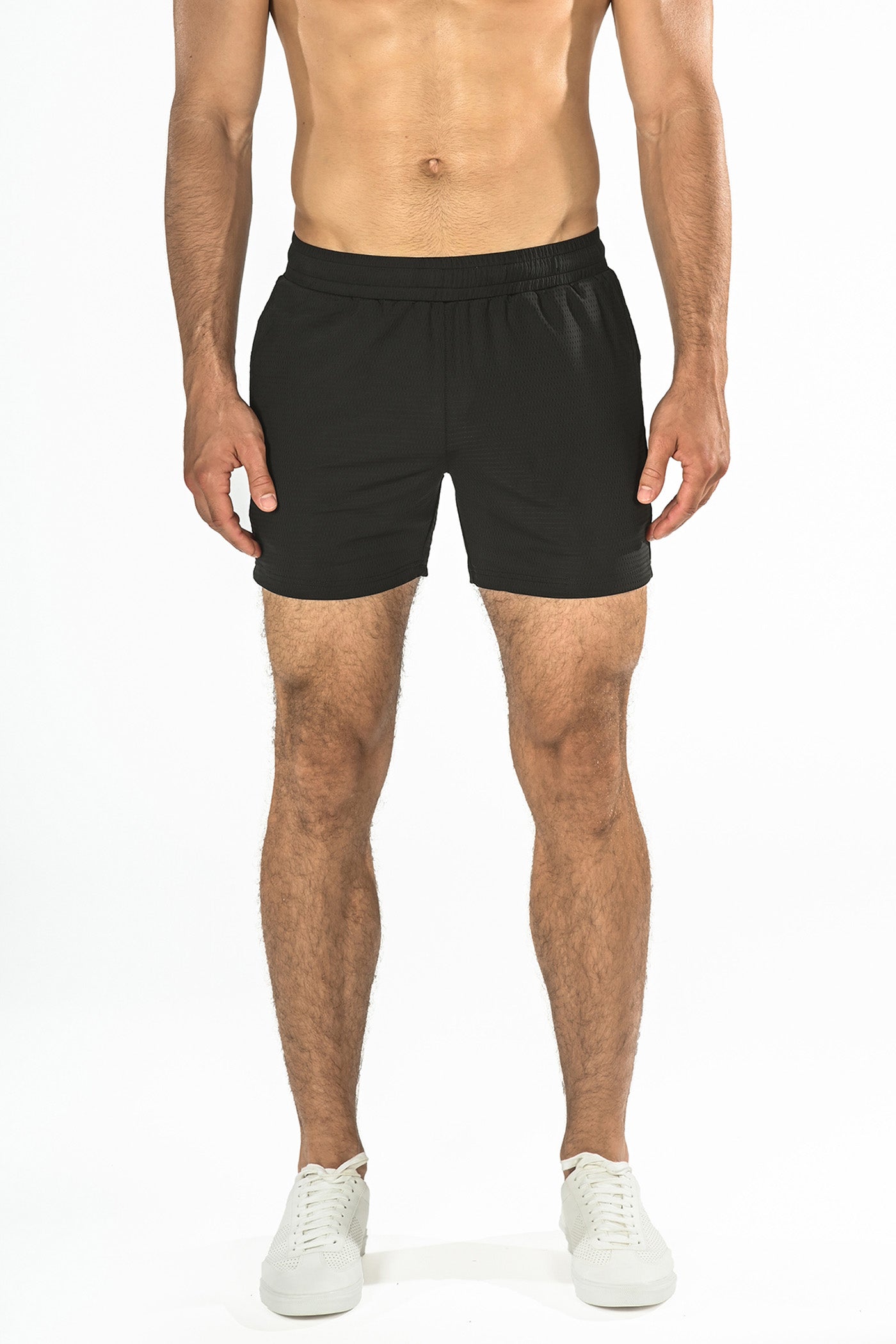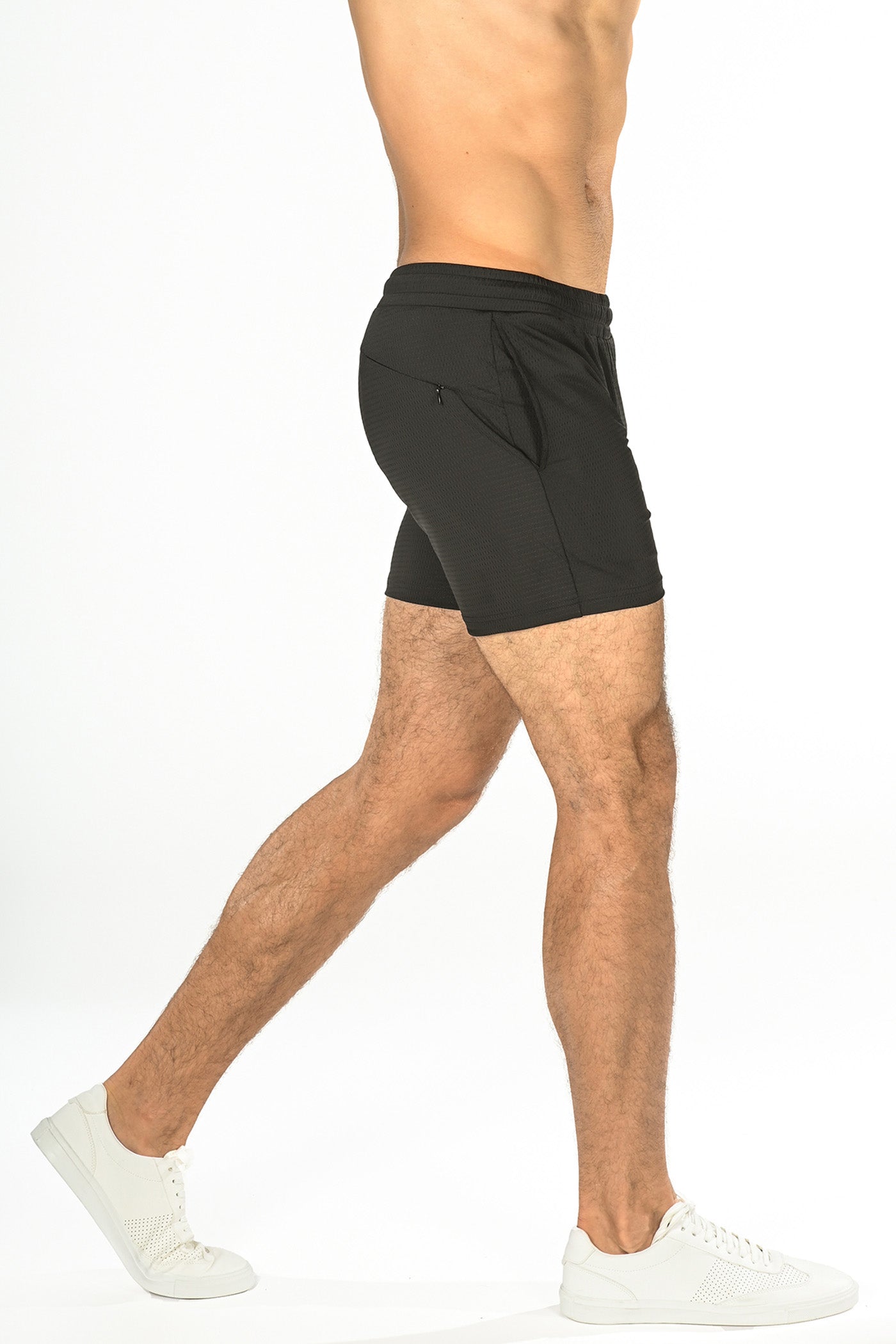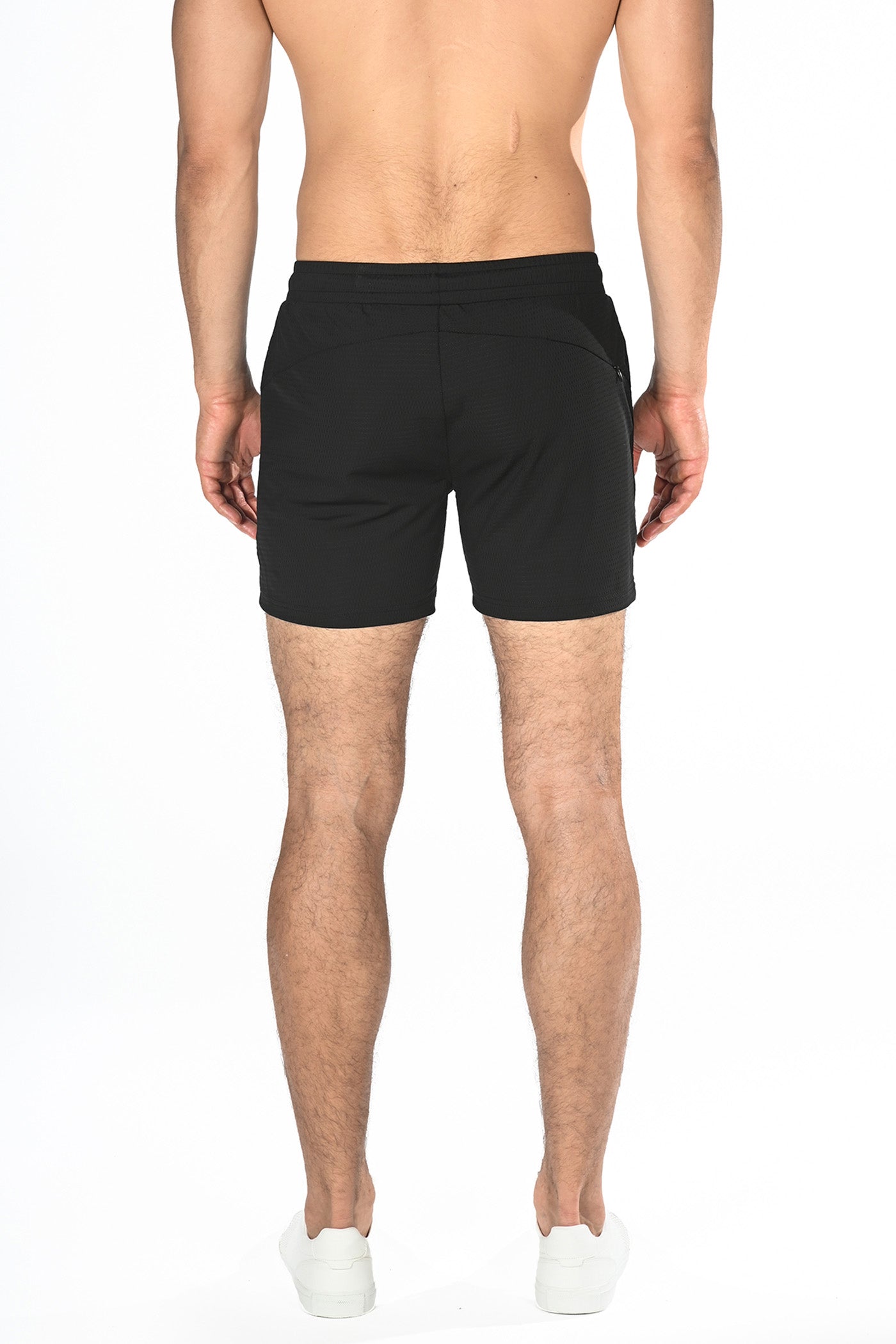 Textured cord Black performance shorts with a tapered fit and shorter leg inseam for an enhanced, sleek silhouette. Features a relaxed elastic waistband with interior drawstring, two side pockets, a right-side back pocket with invisible zipper and a curved back yoke panel. Fabricated from a super soft, sweat-wicking, 4-way stretch textured vertical rib knit fabric for maximum performance and breathability. Inseam length is 4.5". Unlined.