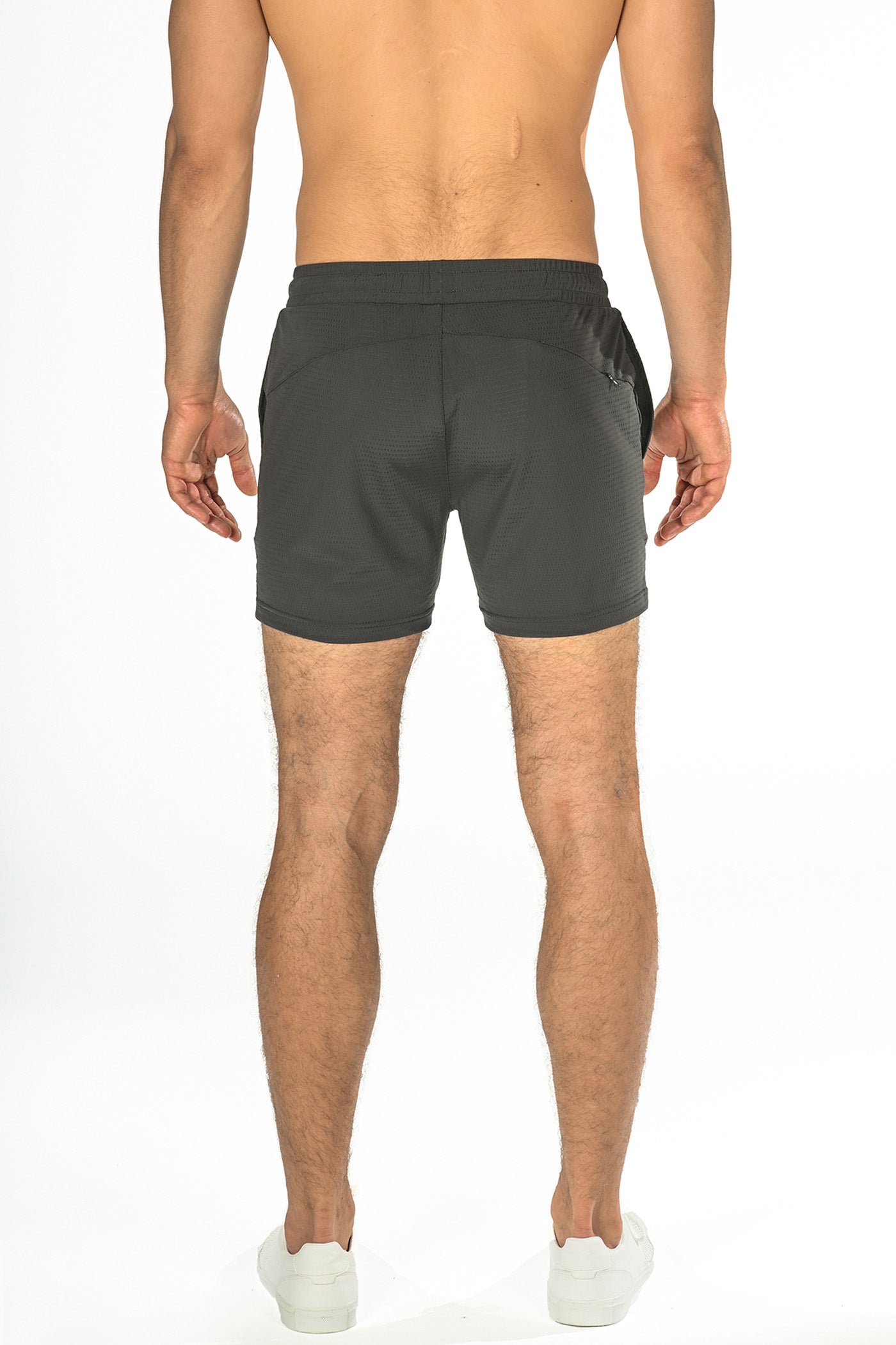Textured cord Black performance shorts with a tapered fit and shorter leg inseam for an enhanced, sleek silhouette. Features a relaxed elastic waistband with interior drawstring, two side pockets, a right-side back pocket with invisible zipper and a curved back yoke panel. Fabricated from a super soft, sweat-wicking, 4-way stretch textured vertical rib knit fabric for maximum performance and breathability. Inseam length is 4.5". Unlined.